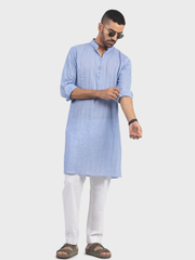 Dazzle under the celestial glow with our Sky Shimmer Elegance kurta, a seamless fusion of powder blue hues, delicate golden and blue thread stripes with ivory button detailling embodying the spirit of festivity and grace. Pair it with our cotton trousers for the perfect festive look!